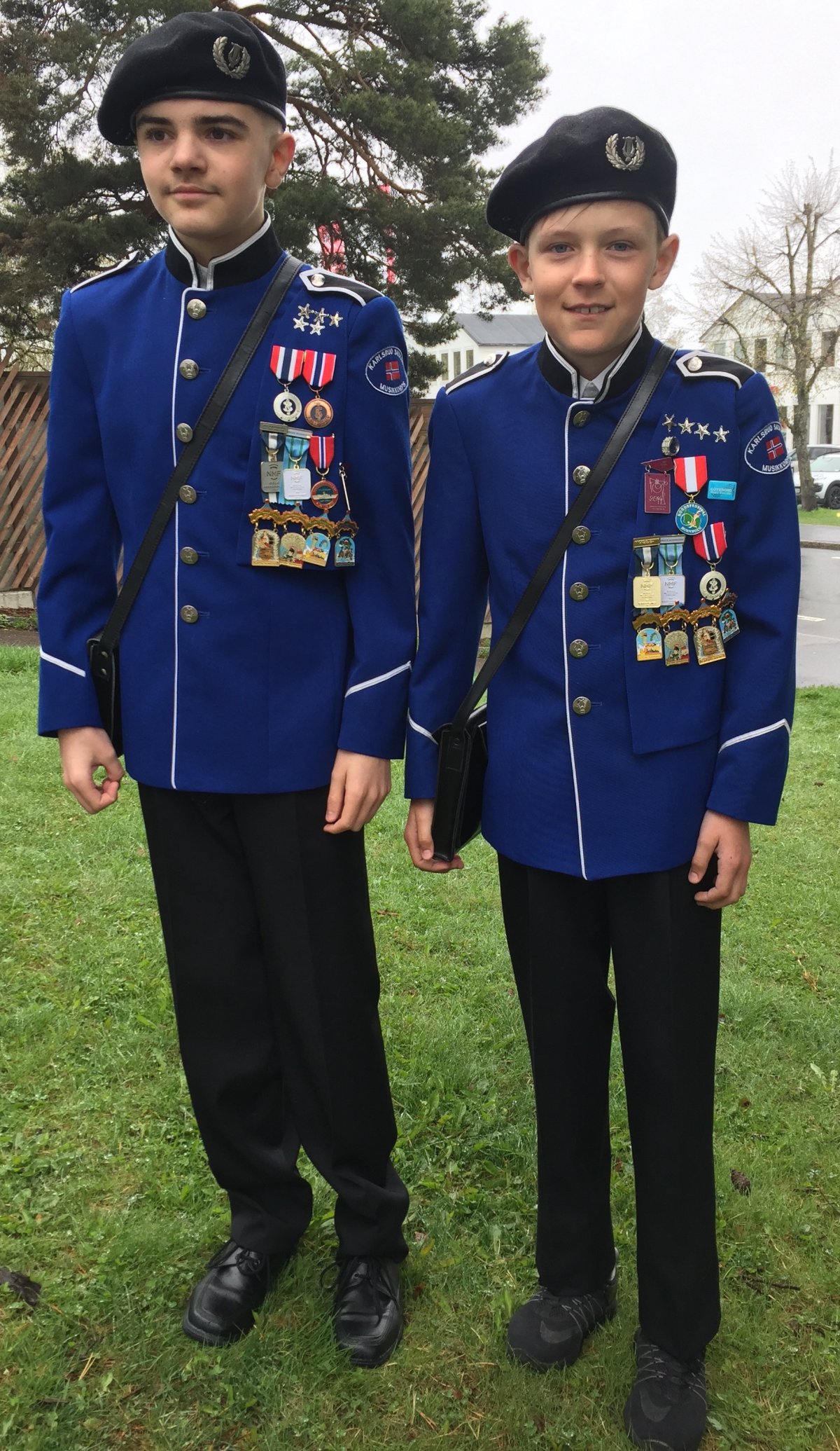 | Alle tre korps | T-skjorte med korpsets logo, blå olabukse uten hull og noteveske (med regnfrakk). Ingen krav til sokker og sko |