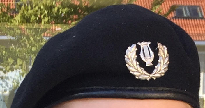 | Beret med krans og lyre. Det følger med et strikkbånd som kan brukes på vrangsiden for å feste lyren. Bereten brukes med krans og lyre over venstre øye. Knuten skal være sentrert bak mot nakken og metallhullene vil da kunne under bretten på beret. | Beret |